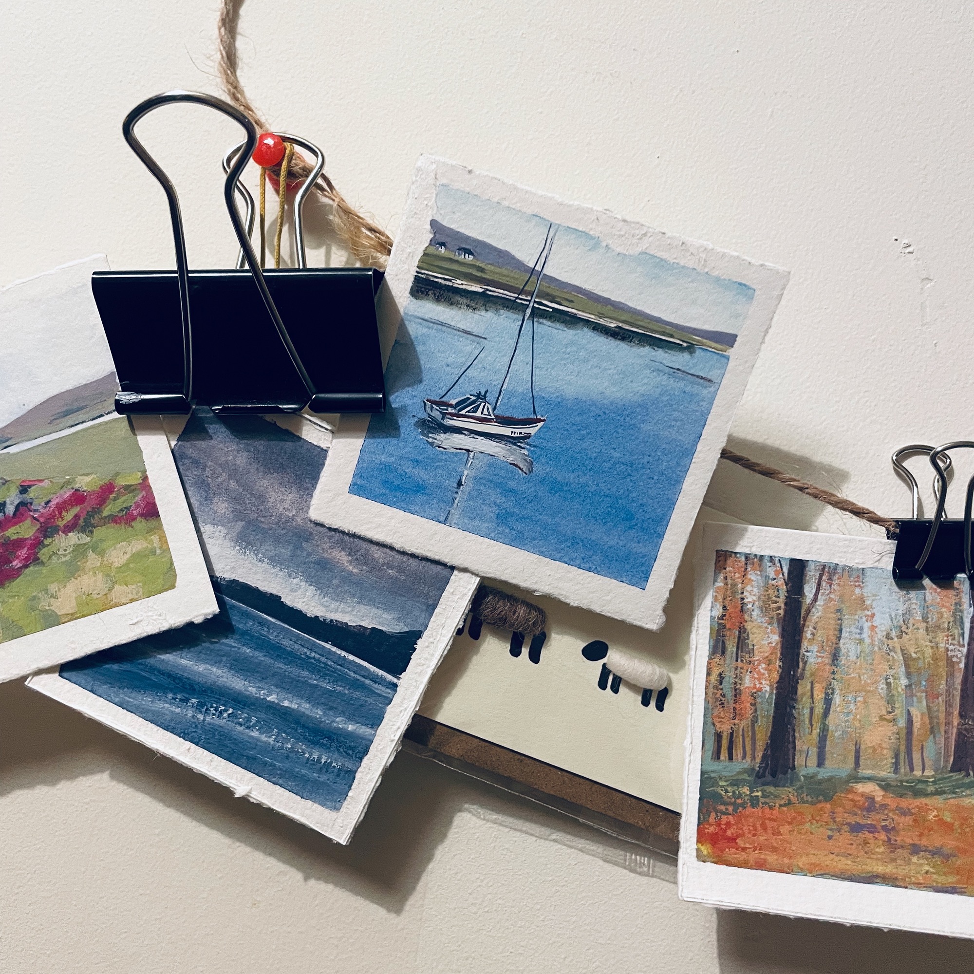 Here’s my little art making corner : mainly painting stuff so a paint-splattered desk with jars full of brushes and 2 for water, a couple of stained cloths, the paint palette I’m currently using, an easel or a drawing board on the desk. Probably one or two bookshelves with art books and a few (a lot of) trinkets, little objects, souvenirs, postcards, figurines, my camera and probably a few framed photos.